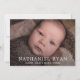 Carte faire-part de naissance garçon moderne avec un design épuré et minimaliste avec le nom du bébé dans une grande police serif avec ses statistiques de naissance sur votre photo de fond de sang préféré. L'arrière a une photo carré avec votre message personnalisé en noir sur un arrière - plan blanc. Cette carte simple mais élégante est une excellente façon d'annoncer l'arrivée de votre bébé garçon.