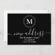 Simple et élégant fond noir avec un délicat monogramme de couronne botanique blanche, typographie blanche pour les détails de la nouvelle adresse.