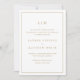 Faire-part de mariage simple avec un design moderne et élégant avec votre monogramme de deux lettres en haut et vos informations entourées d'une fine bordure. Tout le texte est en or faux, sur fond blanc et les polices et les couleurs de fond peuvent être modifiées à votre guise en cliquant sur le bouton "personnaliser". Le modèle comprend une formulation traditionnelle qui rend cette annonce parfaite pour un mariage formel. Un design chic et élégant idéal pour un couple minimaliste.