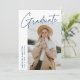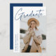 Carte de faire-part moderne de graduation avec une des photos du diplômé sur le devant avec "Graduate" dans une écriture manuscrite bleu marine avec un arrière - plan blanc. Personnalisez avec le nom du diplômé, le nom de l'école et l'année de fin d'études. La faire-part minimaliste de graduation inverse pour afficher 4 photos dans une mise en page de type grille avec les plans futurs du diplômé ou d'autres textes personnalisés ci-dessous. Le faire-part de 5 diplômes photo est parfait pour les diplômés du secondaire et du collège.
