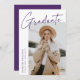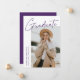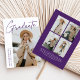 Carte de faire-part moderne de graduation avec une des photos du diplômé sur le devant avec "Graduate" dans une écriture violette manuscrite avec un arrière - plan blanc. Personnalisez avec le nom du diplômé, le nom de l'école et l'année de fin d'études. La faire-part minimaliste de graduation inverse pour afficher 4 photos dans une mise en page de type grille avec les plans futurs du diplômé ou d'autres textes personnalisés ci-dessous. Le faire-part de 5 diplômes photo est parfait pour les diplômés du secondaire et du collège.
