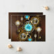 Turquoise lenses with antique watch with brass gears and golden keys on rusty, brown background. Steampunk style.