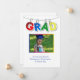 Un carte photo mignon pour annoncer la remise des diplômes de votre enfant de l'école maternelle, de la maternelle ou de l'école secondaire. Design utilise le mot "GRAD" dans des couleurs vives et primaires accrochées à une chaîne avec des clips en papier. Le cadre photo a une bordure arc-en-ciel. Il suffit de télécharger votre image spéciale et de customiser le texte pour un memento spécial.