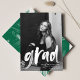 Carte de remerciements moderne de graduation avec la photo du diplômé avec "grad" dans une superposition de script de brosse blanche. Personnalisez le devant de la carte de remerciements de graduation en ajoutant le nom, l'école, le nom et l'année de graduation du diplômé. L'arrière de la carte offre de l'espace pour votre message dactylographié ou manuscrit avec un arrière - plan de touches vertes peintes.