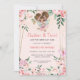 Invitation de fête de fée personnalisable, avec une jolie fée avec des bouquets et une jolie bordure de fleurs, dans les tons de rose rousse, pêche, rose rose poussiéreux avec une bordure géométrique or et des papillons.