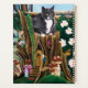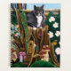 Graue Toms Katze steht auf einem Feenhaus aus einem Baumstumpf. Fee, die Flöte spielt und eine Maus draußen in ihrem Stuhl strickt, umgibt die Katze.