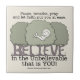 Der kleine Junge wird in einer entspannten Pose hoch in den Baumkronen gesehen, die das obige Zitat illustrieren, das uns daran erinnert, zu halten, zu atmen, zu beten und lassen, den Glauben zu beruhigen. Die Formen der Stämme dieser Bäume prägen das Wort "BELIEVE" und das Zitat "im Unglaublichen, das du bist!" unten, das das bekannte Sprichwort von David A. Carrizales ergänzt. Zeichn ist von Christie Black.