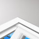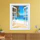 Blue Sea Trompe L'oeil Picture mit Blick auf den Strand von Fake. Optische Täuschung des Fotos mit offenem Fenster und schönem Blick auf das tropische Meer.