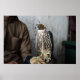 Plakatdruck eines verblindeten Falken für Falken auf dem Handschuh eines Falkenspielers in Doha, der Hauptstadt des Golflandes Katar.