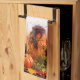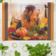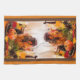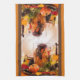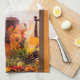 Küchentücher mit einer schönen Dekoreinstellung von Herbstfarben der Roten, Orange, Braunen und Gelben und Falleinzelteile mögen kleine Kürbise, Herbst-Blätter und eine große braune Kerze in einem Hurrikanglas. Die Bilder werden mit einem braunen Streifen hinunter jede Seite und einem orange Streifen hinunter jede Seite von den braunen betont.