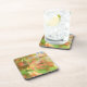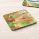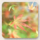Vor dem Hintergrund der grünen Sommer-Blätter eines japanischen Ahorns, der bis Herbstrot und Gelb spült, tropft ein Rose- und Goldskelettblatt langsam in den Boden.