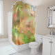 Vor dem Hintergrund der grünen Sommer-Blätter eines japanischen Ahorns, der bis Herbstrot und Gelb spült, tropft ein Rose- und Goldskelettblatt langsam in den Boden.