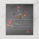 Eine elegante Mischung aus hellen Herbstfloralen schmückt diese zauberhafte, weiche, schwarze Hochzeitsempfehlung, um die zeitlose romantische Atmosphäre Ihrer gotischen oder halben Hochzeit fortzusetzen. Saisonale Aquarellfarben orange, graue und lila Blüten schmücken die Vorderseite mit Leerzeichen für Tischnummern und Namen. Die Rückseite der Karte hat einen eleganten Fall botanischen Kranz umgeben Ihre Paare Initialen und Hochzeitstag. Ein wunderschöner Pop für das Innere mit dunklen Blume im Herbst und Beeren auf dunklem Hintergrund. Versammle alle Seelen zu deinen Rezeptionstischen, um deine ewige Liebe zu feiern.