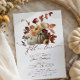 Notre invitation à la douche nuptiale automnale chute dans l'amour boho comprend un magnifique collage de roses de chou, roses de jardin, ranunculus, citrouilles et feuilles. L'invitation est placée sur un arrière - plan blanc avec la date, l'heure et l'emplacement de la douche nuptiale dans une police de caractères de bon goût. Le design bohème et les couleurs automnales apportent une touche de fantaisie et de romantisme, et le design général est parfait pour célébrer la future mariée avec vos proches d'une manière élégante et festive.