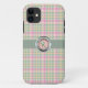 Hübsches iPhone 5 Case-Mate Fall in einem pastellrosa, minzgrün und gelb karierten Muster. Die Grafik einer grünen Band, in der Mitte, ist mit einem rosa und silbernen Tonknopf, mit einem grünen Monogramm mit einem Buchstaben, dekoriert. Personalisieren Sie den Brief für sich selbst oder als eine tolle Geschenkidee. Stilvolle Art, Ihr elektronisches Gerät zu schützen.