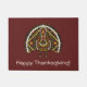 Ein Truthahn maskiert eine elegante Mandala mit Erntedank-Motiven, die in amerikanischen Indianermustern und modernen Ikonen wie Cornucopias, Äpfel und Blätter in Rot-, Gelb- und Orangetönen gehalten sind. Passen Sie den Text auf dieser Tür mit Ihrem eigenen bevorzugten Gruß an oder entfernen Sie ihn ganz, um eine einzigartige Dekoration für Ihren Eingang zu machen.