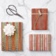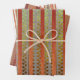 Papierfolien aus verdünntem Rot und Grünstreifen. Stilvolle und schicke Set in Rot-, Grün-, Weiß- und Grautönen. Musterstreifen auf verschiedenen Hintergründen für jedes Geschenkpapier im Set von 3.
