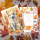 Erleben Sie die Wärme der Saison mit unserer herzlichen Erntedank-Karte! Mit einem liebenswerten weißen Collie Hund und einem Tabby Kätzchen inmitten der Herbstpracht ist es der perfekte Weg, Dankbarkeit auszudrücken. Mit 'Happy Thanksgiving' auf der Vorderseite und einer anpassbaren Nachricht im Inneren, können Sie Ihre herzliche Wertschätzung teilen. Teilen Sie die Liebe diesen Erntedank!"