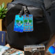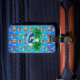 Surfender Entwurf eines Surfer, der eine Welle, gerahmt durch tropische Palmen reitet. Gemusterter Hintergrund der Retro Surfbretter.