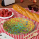 Mehrfarbige Herzen auf orangefarbenem Hintergrund.