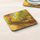 An einem sonnigen Herbsttag schlängelt sich ein überwachter Weg durch den Birkenwald. Die schwarz-weißen Baumstämme kontrastieren mit Blätter und Gras in allen Goldtönen, von hellgelb bis orange, die von den Sonnenstrahlen, die durch die Äste strömen, erhellt werden.