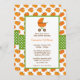 Eine ansprechende Herbstdusche mit einem orangefarbenen Babywagen auf Kürbismuster-Hintergrund und grünem Polka-Dot-Design. Stilvoll und niedlich - Einfach personalisieren für Ihre Babydusche!
