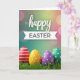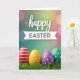 Diese Karte zeigt vier verzierte Ei-Formen, die in einem dicken grünen Grasbüschel ruhen und im unteren Drittel wie Freunde, die sich für ein Foto dicht beieinander anlehnen, nebeneinander angeordnet sind 🐰. Jedes Ei hat sein eigenes Aussehen: eines ist rot mit ordentlichen weißen Streifen, ein anderes ist gelb mit weißen Punkten, ein drittes ist violett mit weißen Punkten und das letzte ist grün mit passenden weißen Punkten. Darüber erscheint das Wort „happy“ in fließender weißer Schrift, zentriert und im offenen Raum schwebend. Direkt darunter befindet sich ein schmaler weißer Banner, der „EASTER“ in dunklen, einfachen Großbuchstaben enthält, was der Nachricht ein ordentliches, ausgewogenes Layout verleiht. Der Hintergrund verblasst in einer weichen Unschärfe aus warmen Rosa-, hellgelben und sanften Teintönen mit runden Lichtflecken, die wie entfernte Laternen an einem Frühlingsabend wirken 🌷. Das Licht ist diffus und sanft, wodurch die Farben reich erscheinen, während