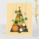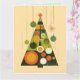 Diese Weihnachtskarte zeigt eine einzigartige, im Stil der Mitte des 20. Jahrhunderts gehaltene Illustration eines Weihnachtsbaums und Weihnachtsschmucks.