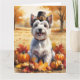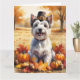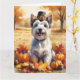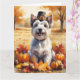 Ein Aquarellbild eines fröhlichen Hundes inmitten eines Haufen lebendiger Herbstlaub, umgeben von winzigen Kürbissen und verstreuten Eichhörnchen. Der Hund trägt einen kleinen Pilgerhut und strahlt vor Freude aus, um den Geist des Erntedanks zu erfassen. Im Hintergrund sorgen weiche Erntefelder und goldfarbene Bäume für eine friedliche Landschaft. Die sanfte Struktur und die warmen, gedämpften Herbsttöne verleihen der Szene ein gemütliches, nostalgisches Gefühl, das perfekt ist, um die Schönheit der Saison zu feiern.