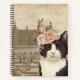 La revue Whimsical bullet présente une photo arrière - plan de teinte sépia vintage d'un château avec des jardins manucurés et la superposition d'un beau chat noir et blanc fantaisie avec couronne fleurie