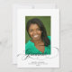 Un faire-part de graduation simple mais élégant avec une photo du diplômé superposée avec le mot "diplômé" en noir élégant script cursif, et des détails de graduation en dessous. L'arrière - plan est en blanc, et l'inverse en noir.
