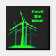 Fang den Wind! - mit einer Grafik einer Gruppe moderner Windkraftanlagen in lebhaftem Grün auf schwarzem Hintergrund.