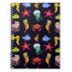 Fantastisches Wassermuster mit einem unterhaltsamen Orangenpferd, Krabben, Quallen, Oktopus, Seestern auf dunkelblauem Hintergrund. Vintage Darstellung