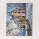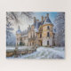 Schöne künstlerische Darstellung eines imaginären verlassenen französischen Schlosses im Winter mit verzierten Steinarbeiten, Schornsteine und Schneeschuhen.