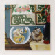 Eine Tabby-Katze sitzt neben einer Fischschüssel und starrt in einem mythischen Meerpferd namens Hippocampus.