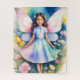 Jigsaw Puzzle eines jungen Mädchens mit Feenflügeln, stehend inmitten eines lebhaften Gartens voller bunter Blume und Schmetterlinge. Ihr Kleid verbindet Pastelltöne, die die magische und skurrile Atmosphäre der Szene verstärken.