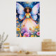 Das Poster eines jungen Mädchens mit Schmetterlingsflügeln steht in einem lebendigen Garten, umgeben von bunten Blume und leuchtenden Sternen. Ihr Kleid ist farbenfroh, und sie trägt eine Krone Blume in ihrem lockigen Haar.
