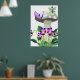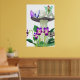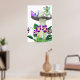 Poster einer kleinen Fee mit grünen Flügeln auf einem großen, gepunkteten Pilz, begleitet von einem lila Schmetterling. Unterhalb blüht eine lebhafte violette Blüte und üppige grüne Blätter verleihen der Kulisse eine ganz besondere Note.