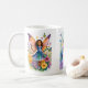 Tasse mit jungen Feen mit lebhaften Schmetterlingsflügeln, umgeben von bunten Blume, die ein Gefühl von Magie und Laune ausstrahlen.