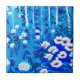 Keramik Kacheln in einer halbabstrakten Abbildung eines Fantasy-Waldes mit Blume, Blättern, Bäumen und Vögeln, in Kobaltblau-Weiß-Schattierungen