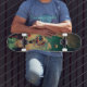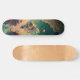 Fantasy Wand Art Skateboard. Eine skurrile digitale Abbildung eines Luftschiffs, das wie Zeichentrickfiguren geformt ist und durch den Himmel mit schwimmenden Inseln und seltsamen Pflanze unter dem Himmel ragt. Der Charakter hat große Augen und lange Tentakel, die von seinem Körper hängen und eine surreale Atmosphäre schaffen. Im Hintergrund ist eine Fantasielandschaft voller magischer Kreaturen und farbenfroher Flora. Inspiriert im Stil von Pop-Kunst und Surrealismus