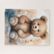 Puzzle eines niedlichen, flauschigen Teddybären, umgeben von sanftem, wasserfarbigem Laub, das ein sanftes und skurriles Ambiente verleiht. Warme Erdtöne und zarte Pinselstriche verstärken den liebenswerten Ausdruck des Bären.