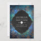 Vintage Hochzeit Save the Date mit einem Kalkboard vor einem hellen, funkelnden Damast Hintergrund in Akzenten von Kupfer und Blau.