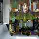Ein junger männlicher Zauberer, der ein altes Buch mit einem niedlichen kleinen grünen Drachen auf dem Buch hält. Hinter ihnen befindet sich eine Bibliothek voller Bücher, Tränke, Kessel, Kristallkugel und Pflanze