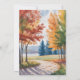 Ein Aquarellbild einer Herbstlandschaft mit einem schmutzigen Weg, der sich durch farbenfrohe Bäume zieht. Die Bäume auf den links haben tiefrote und orangefarbene Blätter, während die Bäume auf der rechten Seite von Gelb zu Grün übergehen. In der Mitte steht ein großer blauer Kiefernbaum. Der Weg ist in warmen Brauntönen gestrichen, die Blätter sind gefallen und orange. Der Hintergrund ist mit sanften Hügeln in gedämpften Blau- und lila Tönen gestaltet. Der Himmel ist in sanft blauen und weißen Wellen gestrichen, was eine friedliche Herbstatmosphäre schafft. Das Gras entlang des Weges wird in verschiedenen Grün- und Goldtönen gerendert. Das Bild hat einen lockeren, ausdrucksstarken Stil, der typisch für Aquarelltechniken ist, mit sichtbaren Pinselstrichen und Farbblutungen. Die Komposition wird mit den Bäumen ausgeglichen, die starke diagonale Linien erzeugen, die vom Vordergrund zum Hintergrund führen. Die Farbpalette besteht aus Rot, Orangen, Gelb, Grüntöne, Blues und Braun, die das Wesen eines Herbsttages einprägen.