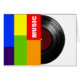 Hälfte eines schwarzen Schallplatten in einem farbigen Cover von vertikalen großen Streifen geschrieben MUSIC