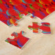 Gelbe, blaue, türkisfarbene, schwarze, lila und grüne Blasen verfärben sich auf rotem Hintergrund.