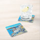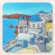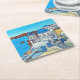 Lebhaftes, stilisiertes Gemälde von Santorini, Griechenland mit seiner majestätischen blauen Kuppel der beliebten Künstlerin Lisa Lorenz auf einem Untersetzer.