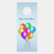 Dieser Türhänger aus Papier hat einen Haufen von bunten Ballons in einer Vielzahl von Farben mit passenden hängenden Bändern auf einem hellblauen Hintergrund. Passen Sie Ihren Text auf der Vorder- und Rückseite mit der Vorlage an.