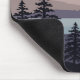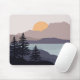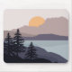 Abstrakte Illustration von farbenfroher Bergsee-Sonnenaufgang mit Sonne, Berggipfeln und Pinienbäumen Dekoration für alle, die Natur, Camping, Wandern etc. mögen.